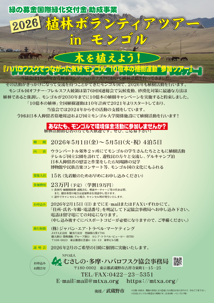 緑の募金国際緑化交付金 助成事業 2026植林ボランティアツアーinモンゴル(武蔵野市後援)のご案内