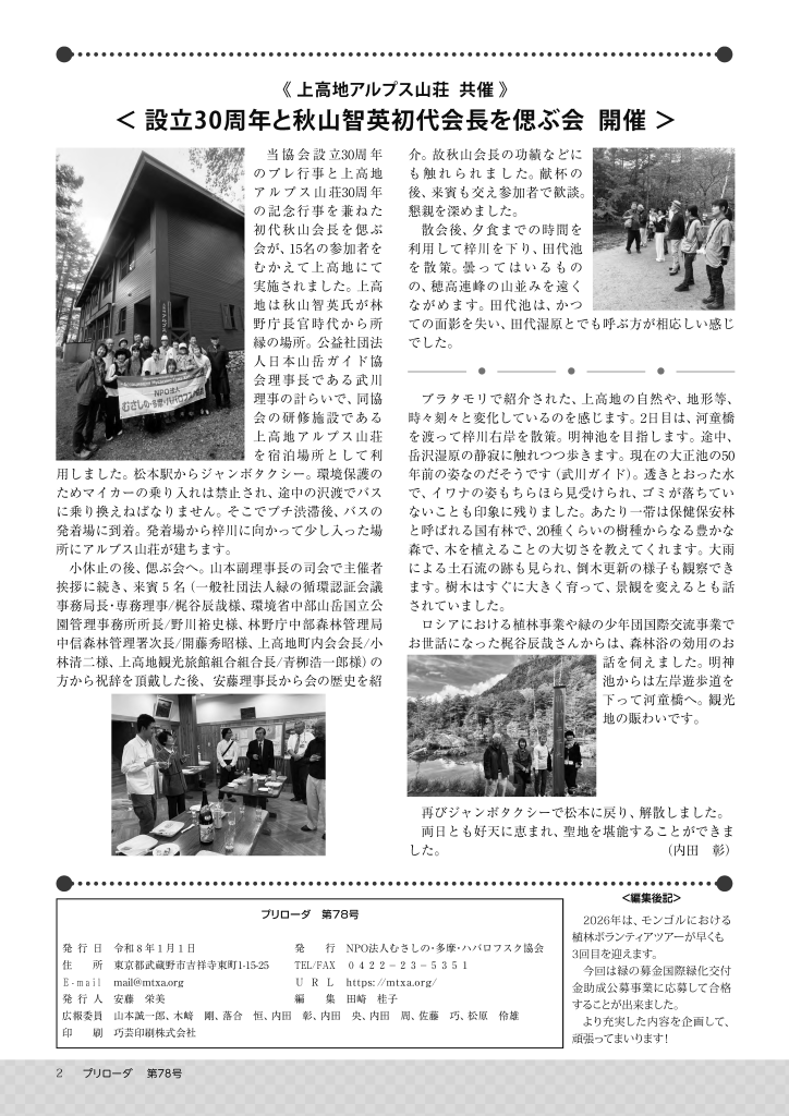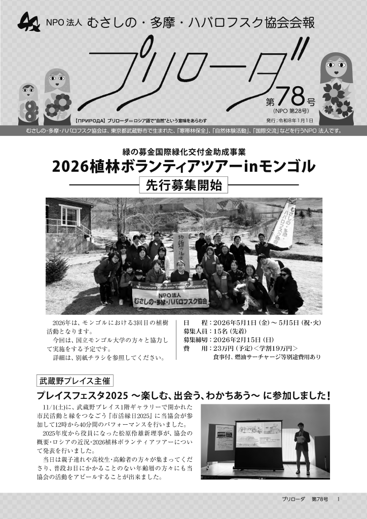 2026植林ボランティアツアーinモンゴル 先行募集開始 プレイスフェスタ2025~楽しむ、出会う、わかちあう~ 参加しました! 設立30周年と秋山智英初代会長を偲ぶ会 開催